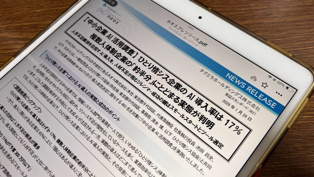 ネオス株式会社と一般社団法人ひとり情シス協会で「中小企業AI活用調査」を実施しました。従業員数500名以下でAIに関心のある経営者の方、情シス関係者の方は、ぜひ見てほしいです。